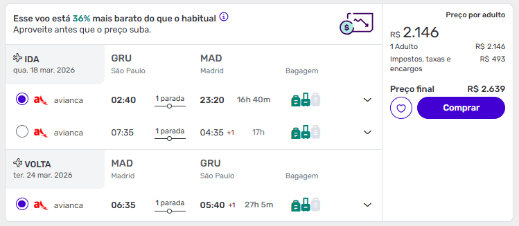Encontramos nesta quinta (16/10), ofertas de voos de ida e volta para Madrid ou Barcelona, a partir de R$ 2.639, com taxas inclusas.
