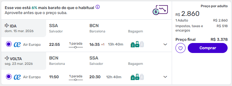 As passagens aéreas mais baratas que encontramos são de voos que partem de São Paulo, Salvador ou Rio de Janeiro, com opções de embarques até março de 2026.