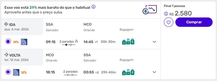 De Salvador para Orlando a partir de R$ 2.580 ida e volta com bagagem.