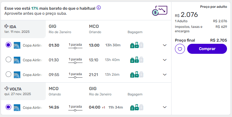 Encontramos hoje, terça-feira (14), passagens aéreas de ida e volta para Orlando a partir de R$ 2.198 com taxas inclusas. São voos com preços até 46% mais baixos do que o praticado.