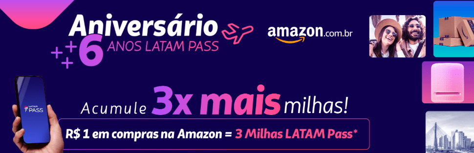 O LATAM Pass lançou uma nova edição da Mega Oferta Amazon Prime, que permite acumular 3 milhas LATAM Pass a cada R$ 1 gasto em compras feitas na Amazon. A promoção é válida até amanhã, dia 10/10/2025.