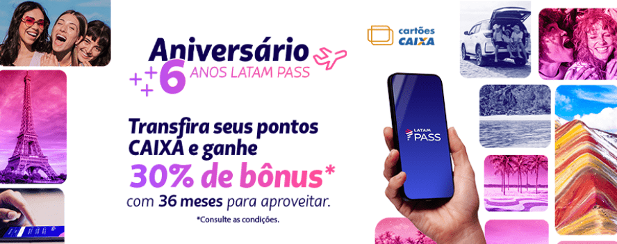A oferta é válida para todos os clientes LATAM Pass. São 30% de milhas bônus* nas transferências de pontos Caixa para o LATAM Pass.
