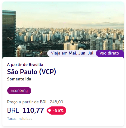 Agora já é possível encontrar voos nacionais a partir de R$ 110, como no trecho Brasília – São Paulo (VCP), com taxas incluídas, como mostra o print abaixo: