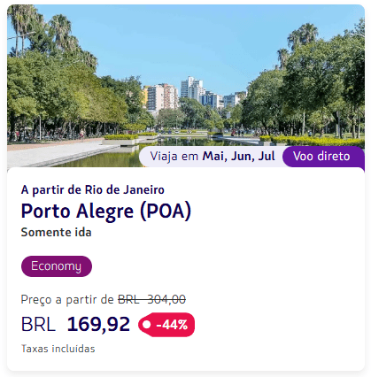 - a partir de R$ 169,92 no trecho Rio de Janeiro – Porto Alegre (POA), com taxas incluídas