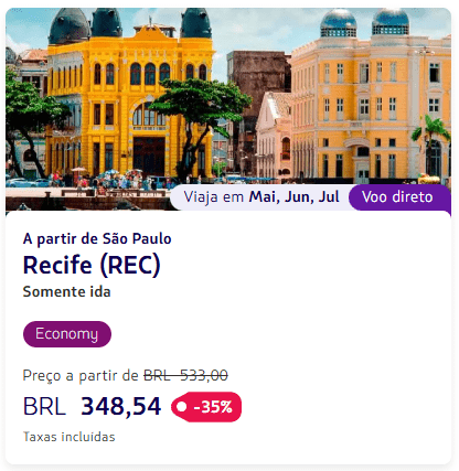- a partir de R$ 348,54 no trecho São Paulo – Recife (REC), com taxas incluídas
