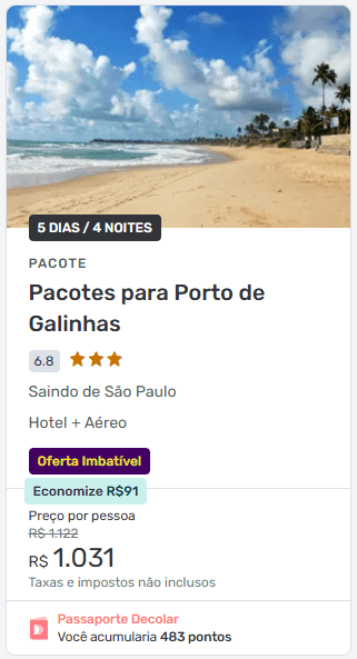 No site da agência de viagem aparecem preços bem agressivos — inclusive com pacotes a partir de R$ 484 por pessoa + taxas, incluindo voos de ida e volta + hospedagem.