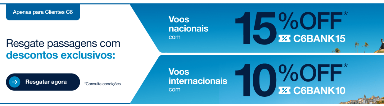 Para voos internacionais, o desconto é de 10%, utilizando o código C6BANK10. Já para voos nacionais, o desconto é de 15%, com o código C6BANK15.