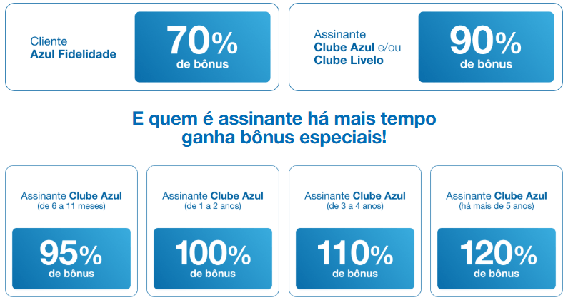 - Clientes Azul: bônus de 70% sobre os pontos transferidos