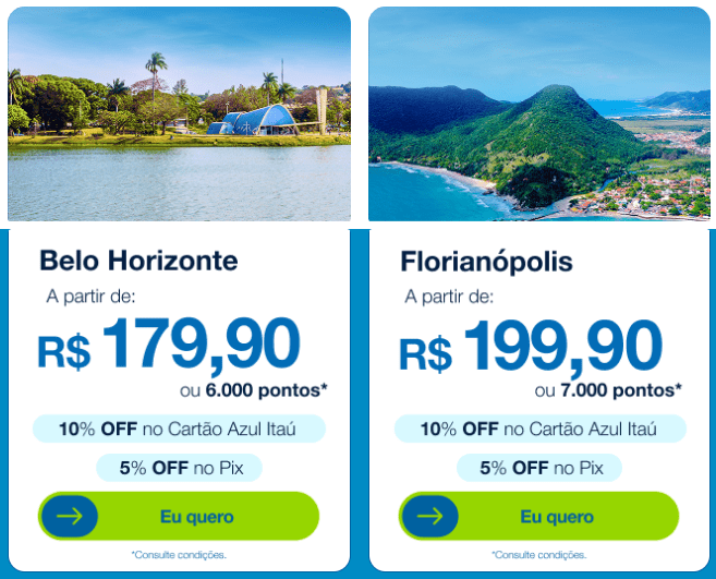 Segundo a companhia, algumas ofertas começam a partir de R$ 179,90 no trecho, enquanto determinados resgates aparecem a partir de 6.000 pontos no Azul Fidelidade, dependendo da rota e da disponibilidade de assentos.