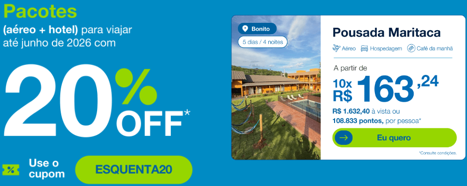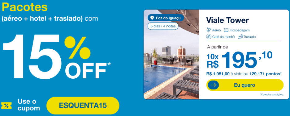 - 15% de desconto em pacotes completos, incluindo opções com aéreo, hotel e serviços adicionais.