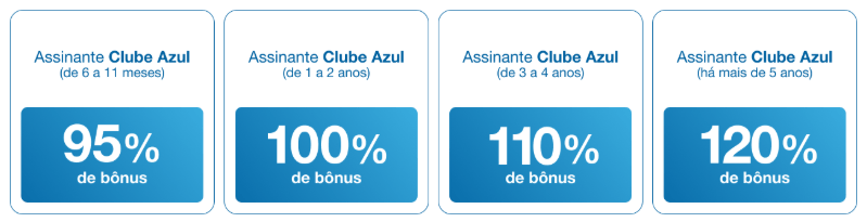 A Azul Linhas Aéreas Brasileiras está com uma campanha relâmpago para transferência de pontos e cashback que pode gerar até 120% de bônus, considerando os adicionais por tempo de assinatura.