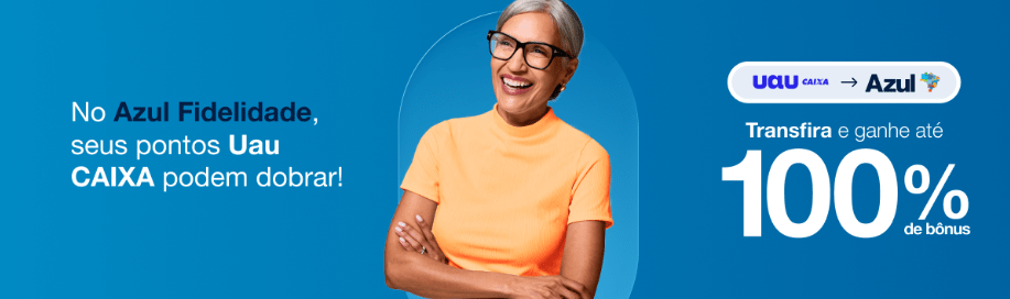 O Azul Fidelidade está oferecendo até 70% de bônus em transferências de pontos Uau CAIXA, com possibilidade de ganhar até 30% a mais, de acordo com o tempo de participação no Clube Azul!