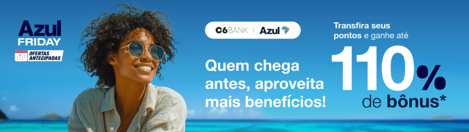 O Azul Fidelidade está oferecendo até 90% de bônus em transferências do C6 Bank, com possibilidade de ganhar até 20% a mais, de acordo com o tempo de participação no Clube Azul!