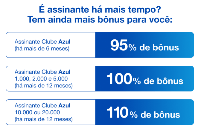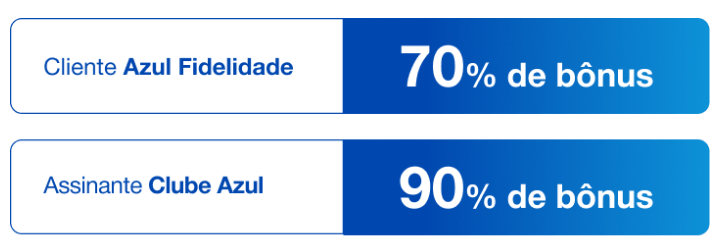 - 90% de bônus: assinantes do Clube Azul com conta ativa;
