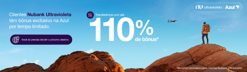 O Azul Fidelidade está oferecendo até 90% de bônus em transferências do Nubank Ultravioleta, com possibilidade de ganhar até 20% a mais, de acordo com o tempo de participação no Clube Azul!