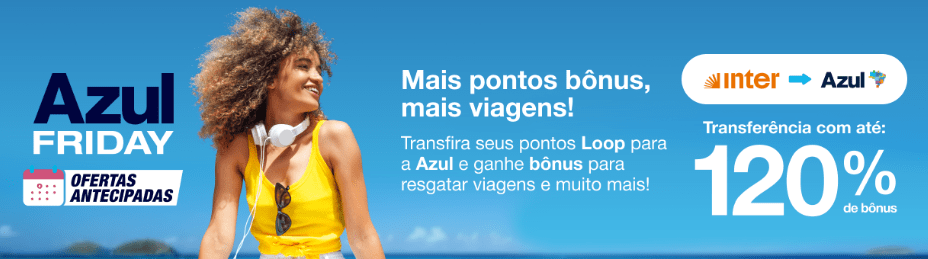 Azul Fidelidade oferece até 120% de bônus em transferências de pontos do Inter Loop
