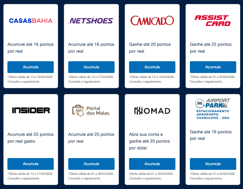 As ofertas são válidas até 30 de abril de 2026, dependendo do parceiro, e podem chegar a até 25 pontos por real gasto.