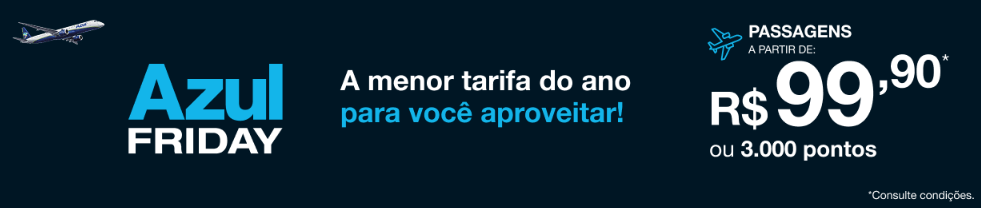 A Azul saiu na frente e lançou a Azul Friday com aquela que promete ser a menor tarifa do ano: passagens a partir de R$ 99,90 o trecho ou 3.000 pontos em rotas selecionadas, para viajar entre fevereiro e junho de 2026.