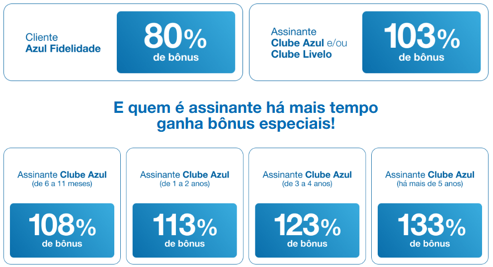 - Clientes Azul Fidelidade: 80% de bônus
