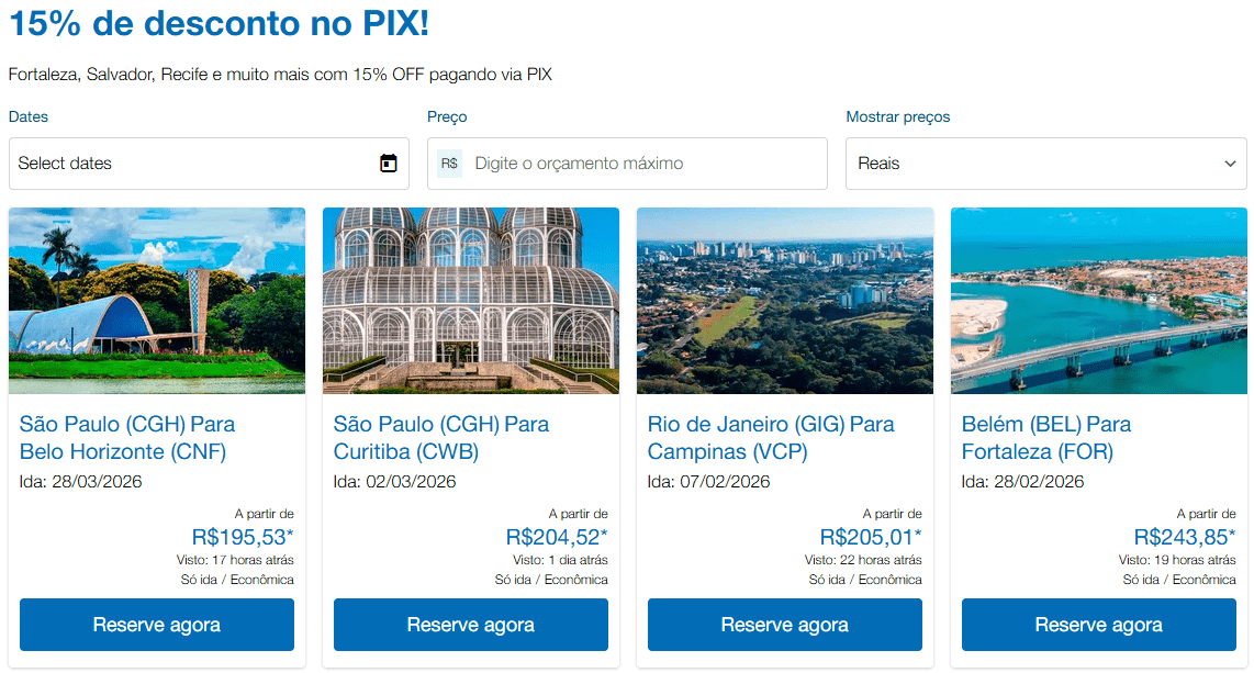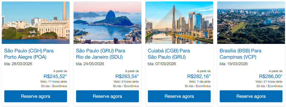 - Trechos como Salvador, Belo Horizonte, Rio, Porto Alegre e Fortaleza com preços reduzidos