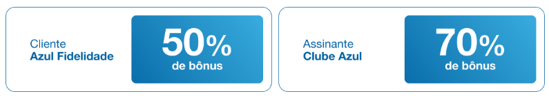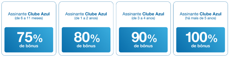 Além do bônus promocional, a Azul concede percentuais adicionais cumulativos para assinantes do Clube Azul conforme o tempo de associação: