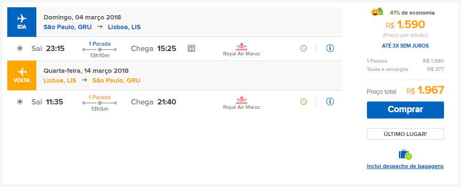 - Rio De Janeiro – Lisbon Ida: 14/mar Volta: 25/mar – R$ 1.967,16
