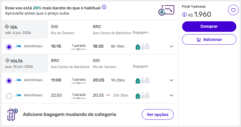 Outro ponto importante: há voos com companhias como Aerolíneas Argentinas e JetSMART, garantindo boas opções de horários e conexões.