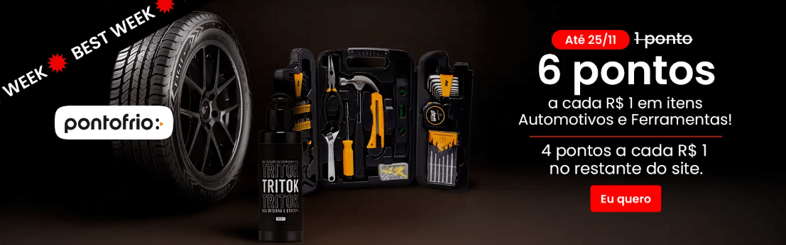 Ponto Frio: 6 pontos a cada R$ 1,00 em Automotivos e Ferramentas e 4 pontos a cada R$ 1,00 no restante do site.