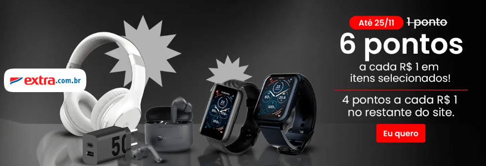 Extra: 6 pontos a cada R$ 1,00 em produtos selecionados e 4 pontos a cada R$ 1,00 no restante do site.