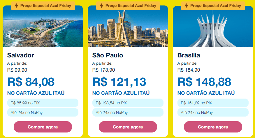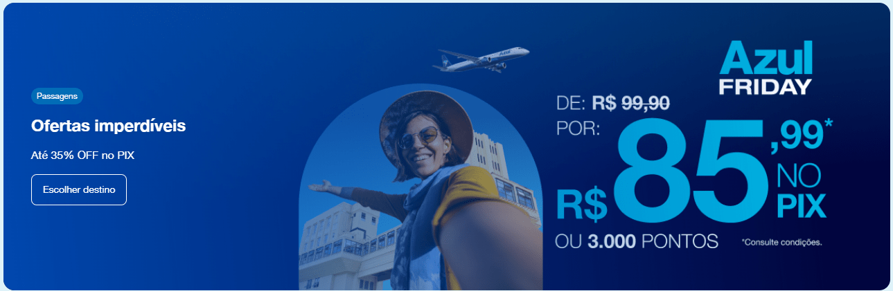 A Azul entrou na Black Friday com preços muito competitivos, especialmente no cartão Azul Itaú e pagamentos via PIX.