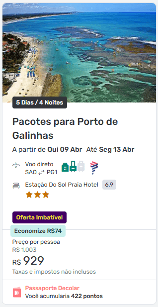 Preço por pessoa no momento da pesquisa: R$ 929 + taxas.