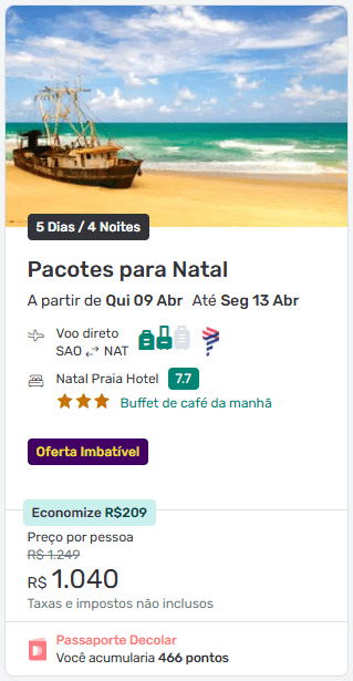 Preço por pessoa no momento da pesquisa: R$ 1.040 + taxas.
