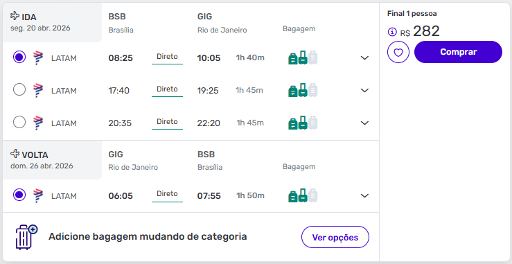 As ofertas mais em conta partem de Brasília, Vitória, Campinas ou Belo Horizonte, mas existem excelentes tarifas também saindo de outras cidades, com datas disponíveis para quem quer viajar até abril de 2026.