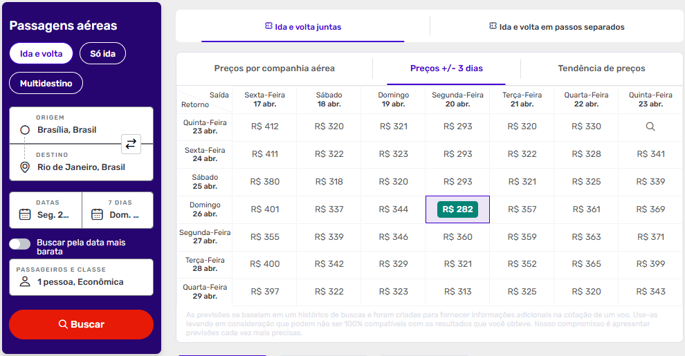 Faça sua busca e depois clique em “Preços +/- 3 dias” que um calendário com combinações de datas com as melhores ofertas irá se abrir.