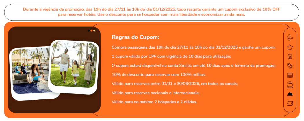 Quem realizar qualquer resgate durante o período da campanha receberá um cupom de 10% de desconto para reservas de hotéis.