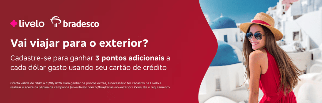 Até 31 de janeiro de 2026, clientes do Bradesco que se cadastrarem na campanha da Livelo conseguem turbinar o acúmulo de pontos em compras internacionais e ainda recuperar o valor do IOF em situações específicas. A ação vale para gastos feitos no exterior ou em sites internacionais, desde que o pagamento seja realizado com cartão de crédito Bradesco.