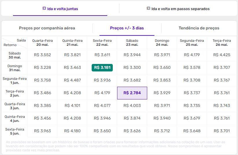 Faça sua busca e clique em “Preços +/- 3 dias” que um calendário com combinações de datas com as melhores ofertas irá se abrir.