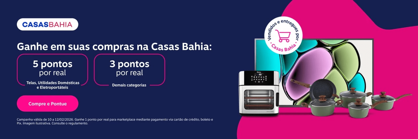 Casas Bahia: 5 pontos por real gasto nas categorias de telas, utilidades domésticas e eletroportáteis; 3 pontos por real nos demais produtos vendidos e entregues por Casas Bahia e 1 ponto por real para marketplace mediante pagamento via cartão de crédito, boleto e Pix.