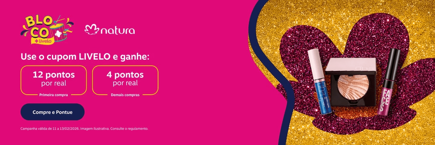 Natura: 12 pontos por real gasto na primeira compra na Natura e 4 pontos por real nas demais compras.
