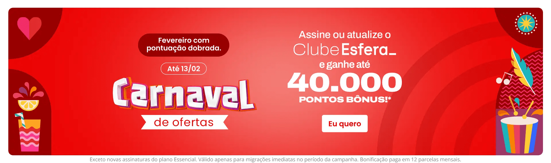 A Esfera está com uma campanha especial de pontuação dobrada, válida até 13/02, voltada para quem assinar ou atualizar o Clube Esfera.
