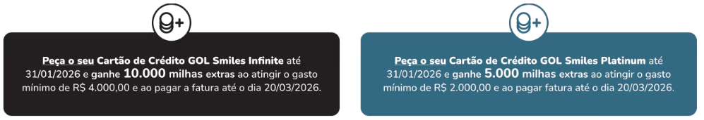 - Cartão GOL Smiles Infinite: bônus de 10.000 milhas ao atingir gasto mínimo de R$ 4.000