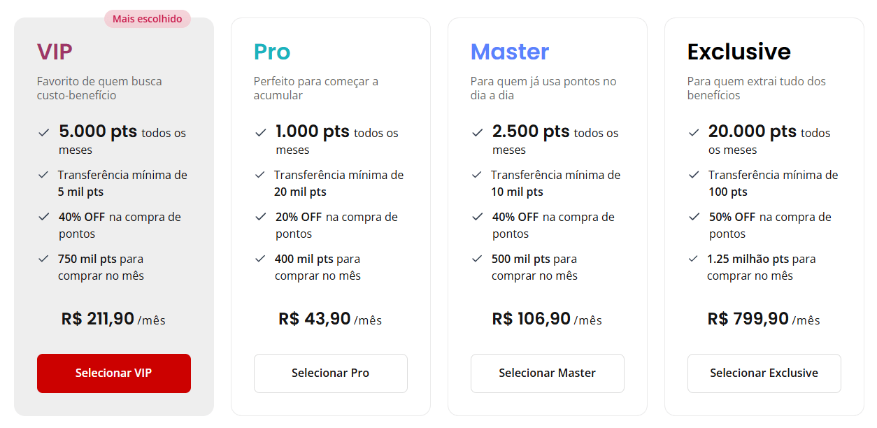 - Exclusive → 20.000 pontos/mês