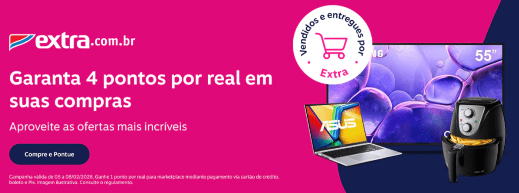 Extra: 4 pontos por real gasto em produtos vendidos e entregues por Extra e 1 ponto por real para marketplace mediante pagamento via cartão de crédito, boleto e Pix.