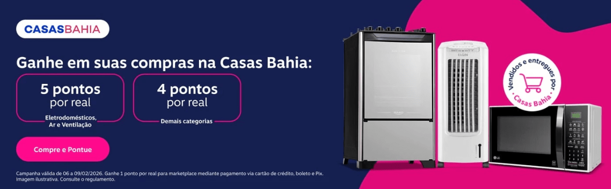 Casas Bahia: 5 pontos por real gasto nas categorias de eletrodomésticos, ar e ventilação; 4 pontos por real nos demais produtos vendidos e entregues por Casas Bahia e 1 ponto por real para marketplace mediante pagamento via cartão de crédito, boleto e Pix.