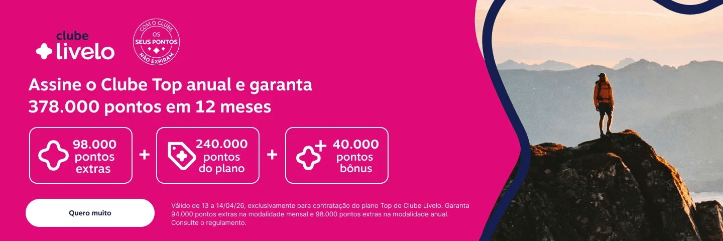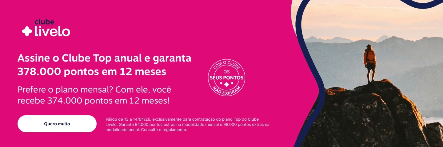 Apesar do destaque para o plano Top, o Clube Livelo oferece opções mais acessíveis, com valores iniciais a partir de cerca de R$ 44,90 por mês. Os planos variam conforme a quantidade de pontos mensais e benefícios adicionais, como: