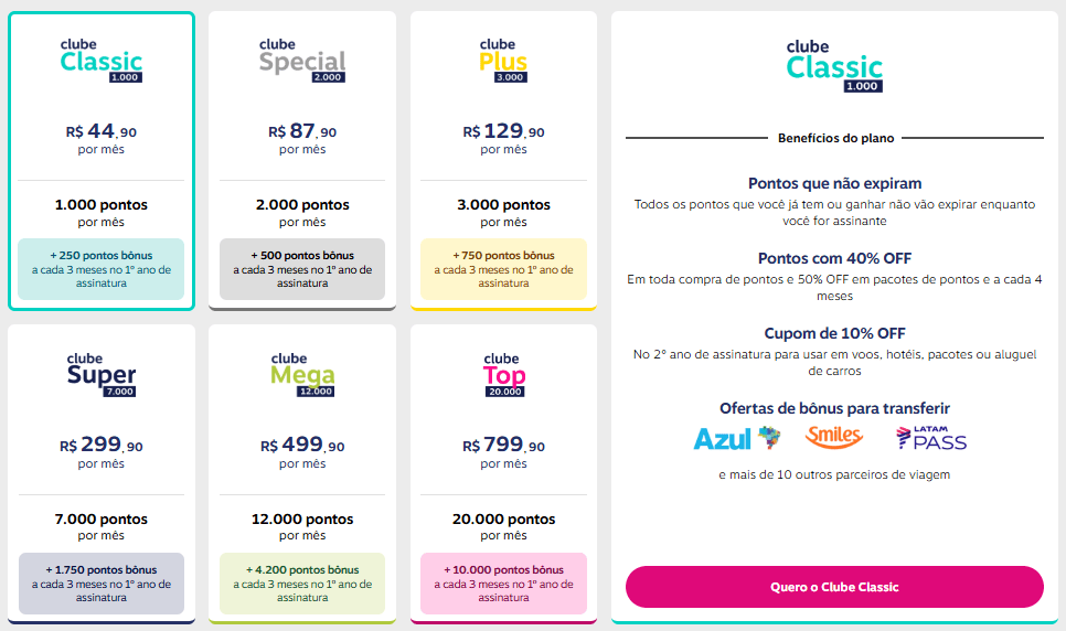 Além disso, quem assina o clube garante 40% de desconto recorrente nas próximas compras de pontos.