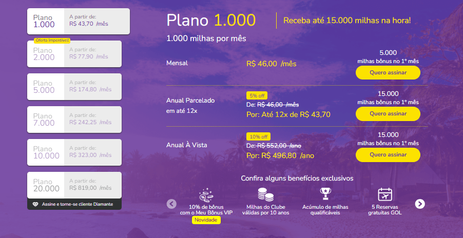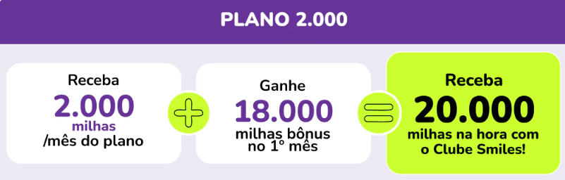 Além das milhas bônus, o cliente recebe mensalmente as milhas correspondentes ao plano contratado.