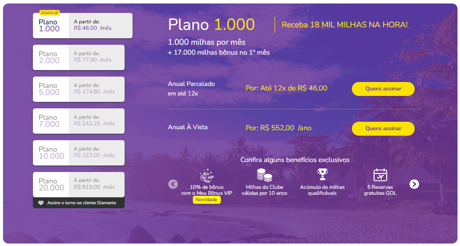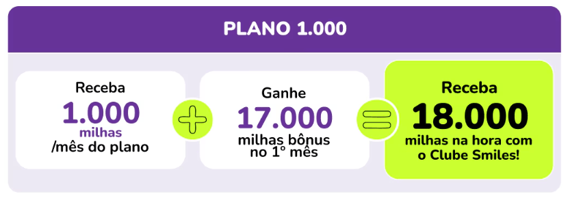 No plano 1.000 — o mais básico do Clube Smiles — o assinante recebe 1.000 milhas mensais, além de um bônus adicional de 17 mil milhas no primeiro mês, totalizando 18 mil milhas creditadas logo após a adesão.