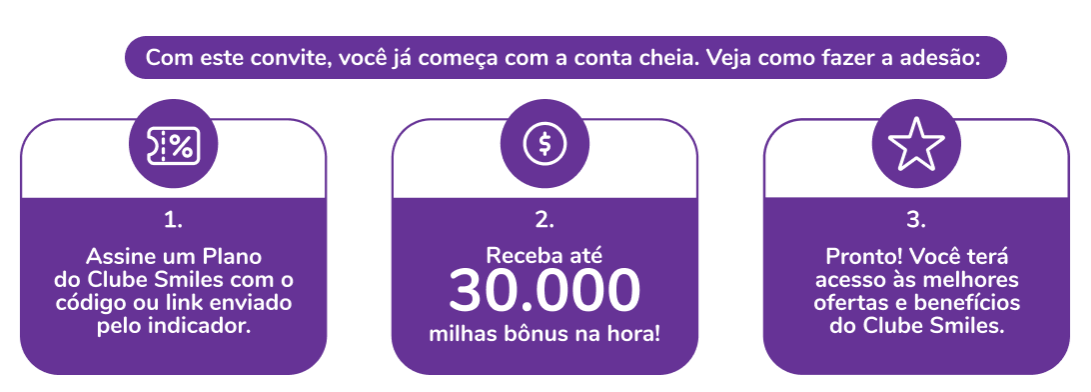 O assinante que faz a indicação recebe 3.000 milhas bônus para cada amigo que aderir ao Clube Smiles pelo link/código e concluir a assinatura. O crédito é realizado em até 72 horas após a confirmação.