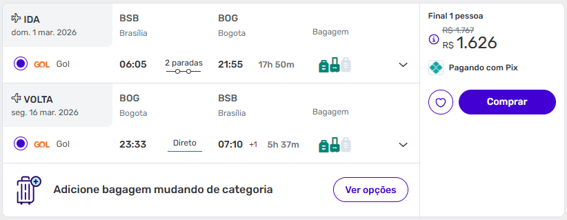 Passagens de ida e volta de Brasília para Bogotá a partir de R$ 1.626